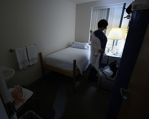 In her dorm sized bedroom for the night, Ryder slips off her white coat, but keeps her scrubs on - just in case she is paged.