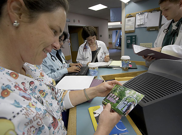 Night nurse Candace Colby-Collier admires Hillary's wedding photographs. Dr. Ryder had been married for a little more than a month when this story was shot.