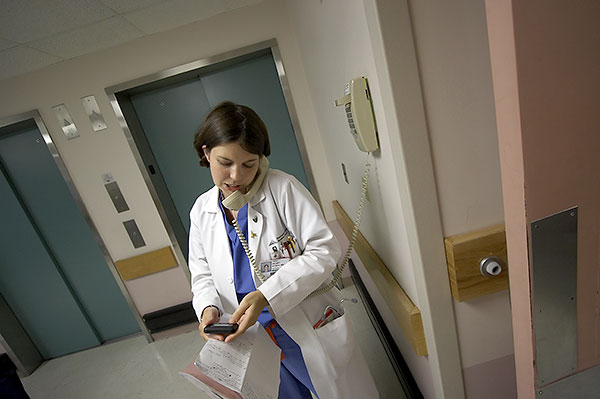 On the way to the Emergency Department to admit patients, Hilary Ryder, MD stops to answer a page.