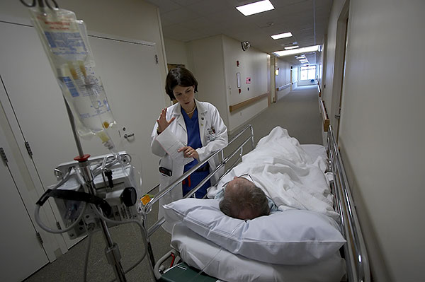 Monday 5:29pm On the way to the Emergency Department to admit a patient, Ryder recognizes one of her patients who is waiting to be brought back to his room after his CT scan. She stops for a quick chat and to check on his status.